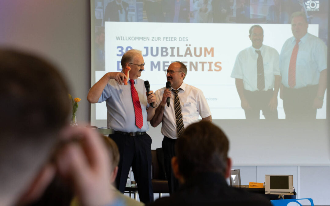 Gleich zu Beginn haben unsere Geschäftsführer uns mit auf eine kleine Zeitreise genommen. Stilecht in alter Verkleidung, so wie früher, standen sie plötzlich da und haben gemeinsam mit uns auf die Anfänge, die Entwicklungen und viele prägende Momente zurückgeblickt. Zwischen vielen Gesprächen, ehrlichen Erinnerungen und so manchem Schmunzeln wurde dabei spürbar, was die MERENTIS bis heute ausmacht: Das Miteinander, derZusammenhalt und die Menschen, die unser Unternehmen über all die Jahre